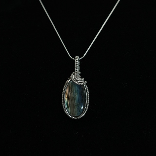 This elegant marquise stone reveals a soft, smoky blue flash when it catches the light. The design focuses on the stone itself — a long, graceful shape with subtle color — framed in a clean, handmade silver-tone wrap.