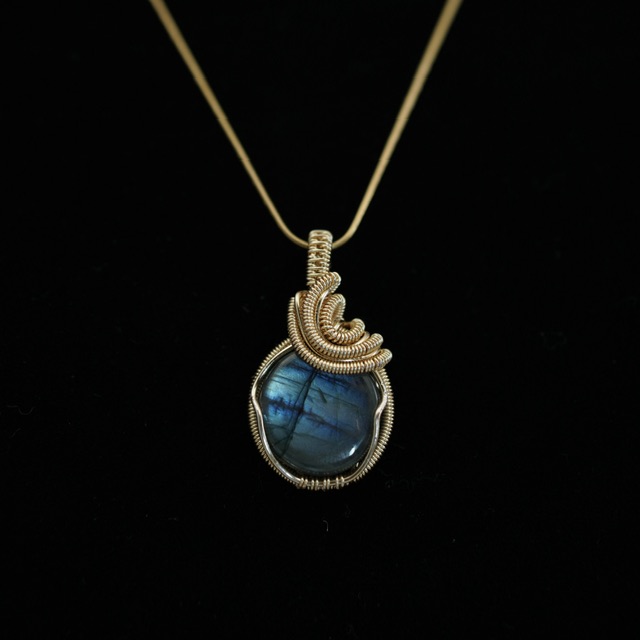 This pendant blends misty green undertones with subtle blue highlights. The wrap has an organic flow, similar to branch or root forms, creating a quiet, earthy aesthetic. Its mood is natural, grounded, and expressive without being bold.