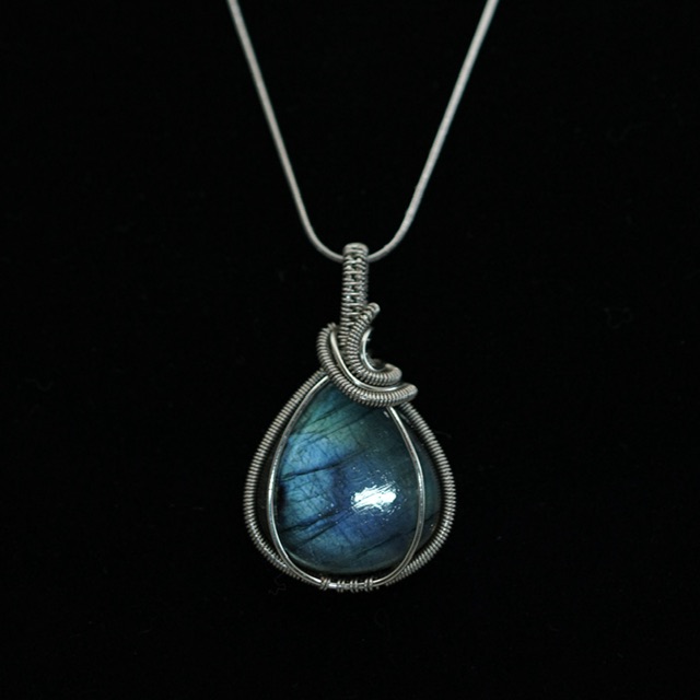 This pendant features a dramatic flash — the kind that labradorite collectors look for. Its rich blue tones appear instantly in the light, like a spark beneath the surface. The wirework curves around the stone in a protective frame, shaped slowly by hand to echo the organic teardrop cut.